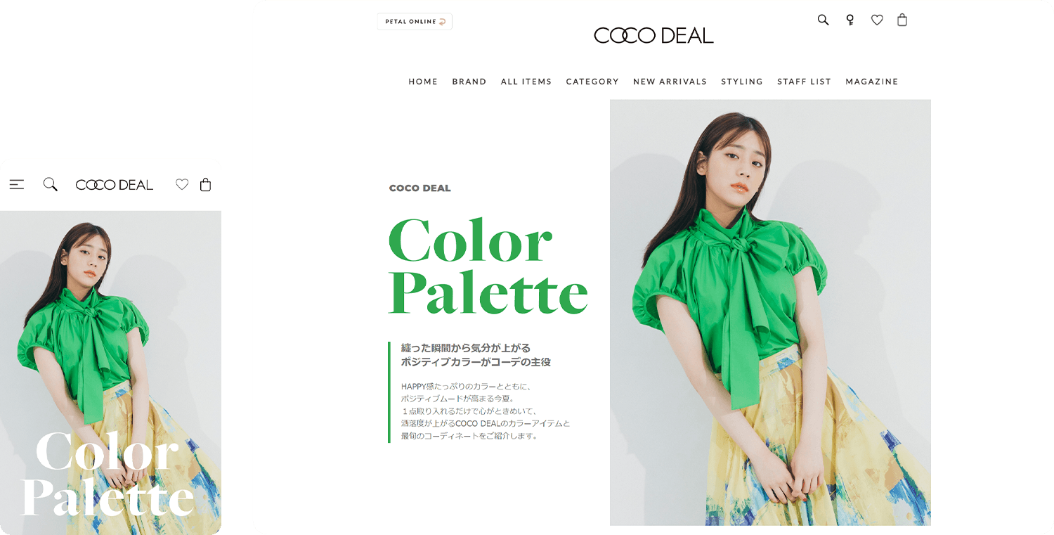 COCO DEAL Color Palette ファッションブランド COCO DEALのLPを制作いたしました。 Type LP Area Web Design Launch 2022.05 Visit Site Next COCO DEAL CLASSIC STYLE LP Prev WHITE AGENCY HP HP