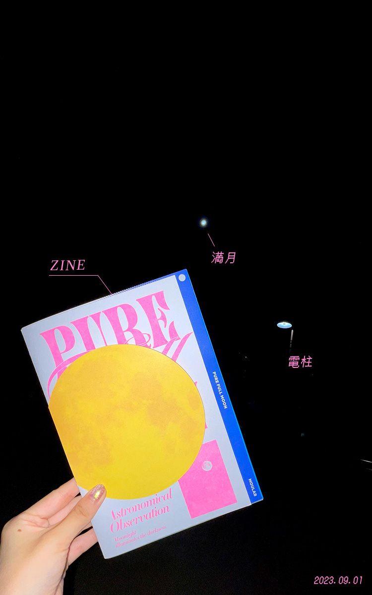 これは絶対満月とZINEを一緒に撮らなきゃと思い、いろいろ格闘した結果、電柱も一緒の上の写真がベストショットに決まりました☝